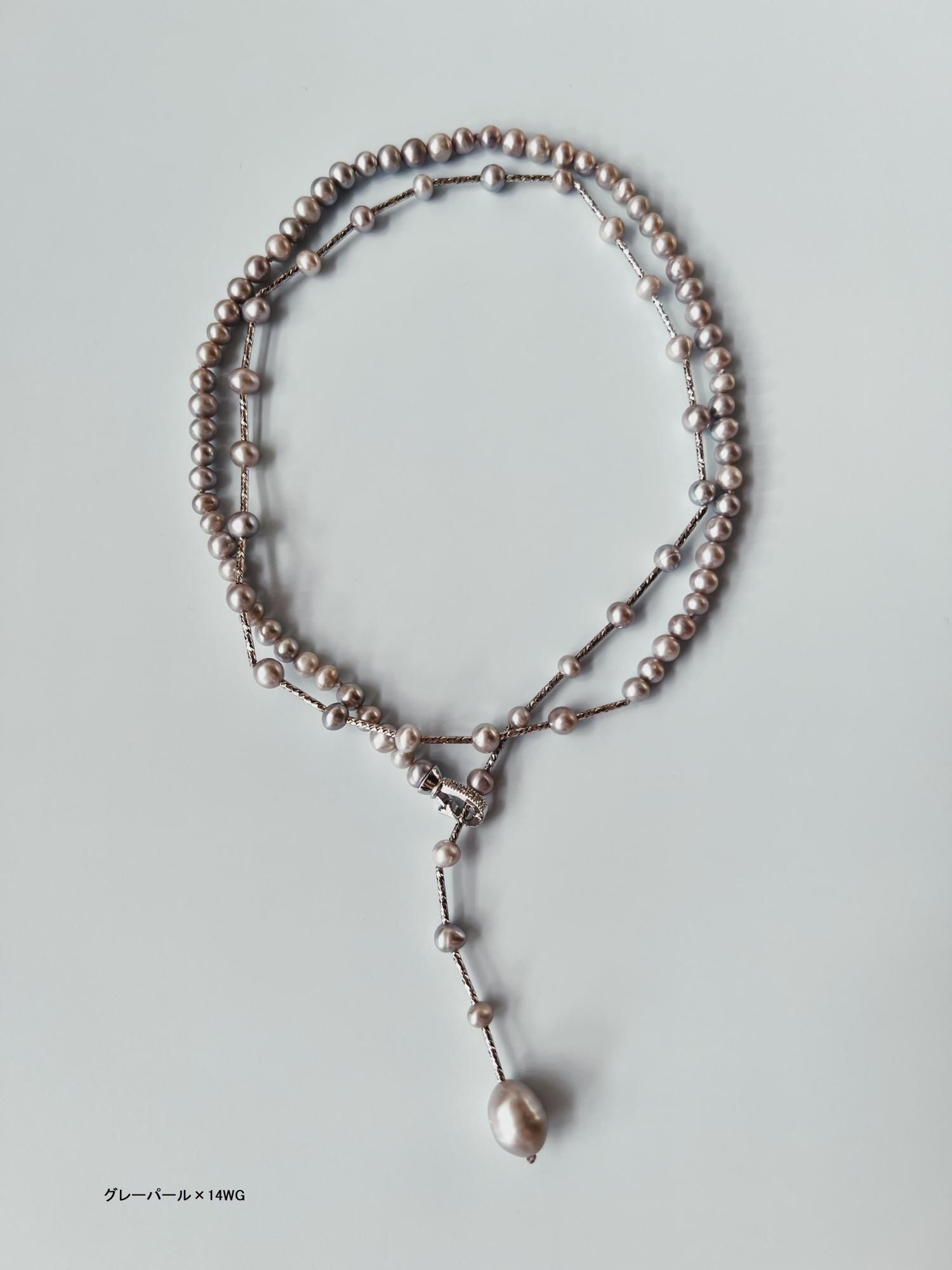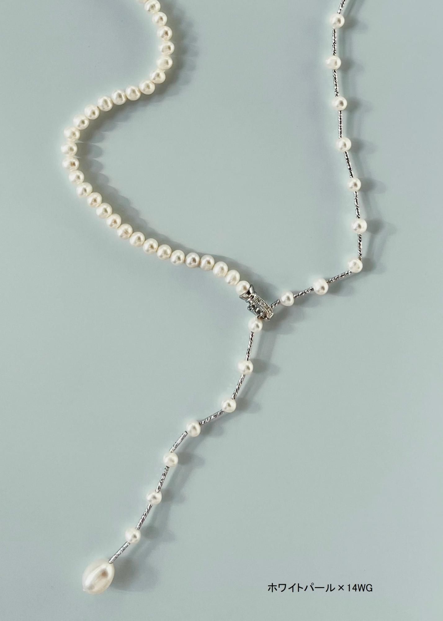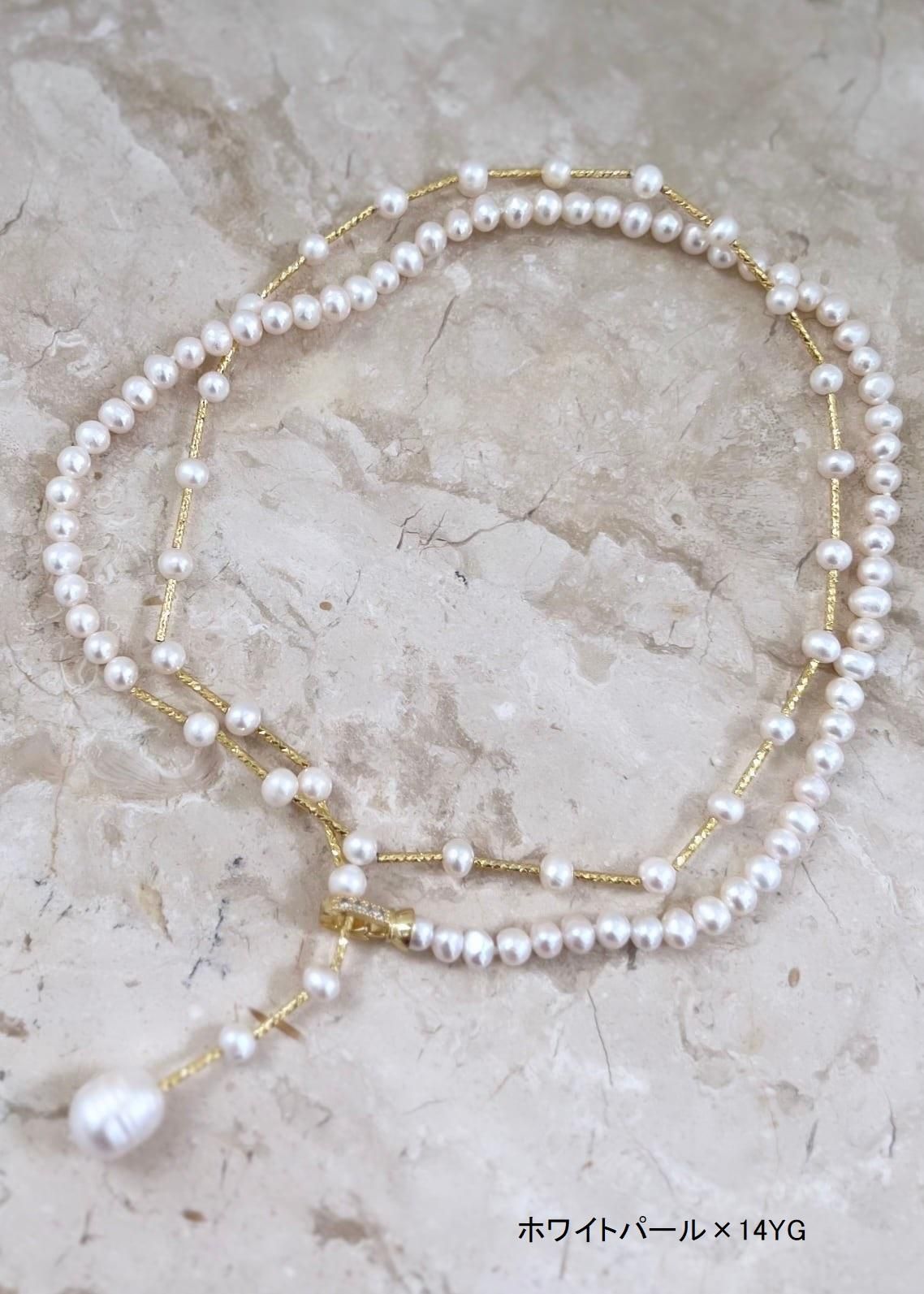 ベビーパールがシンプルに連なる半分とベビーパールに14Kホワイトゴールド(14Kイエローゴールド)プレートパーツを交互に配した半分を組み合わせたデザインのロングネックレスです。