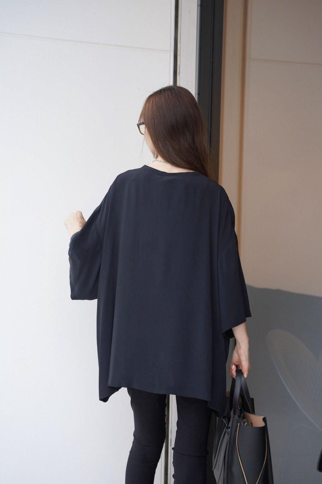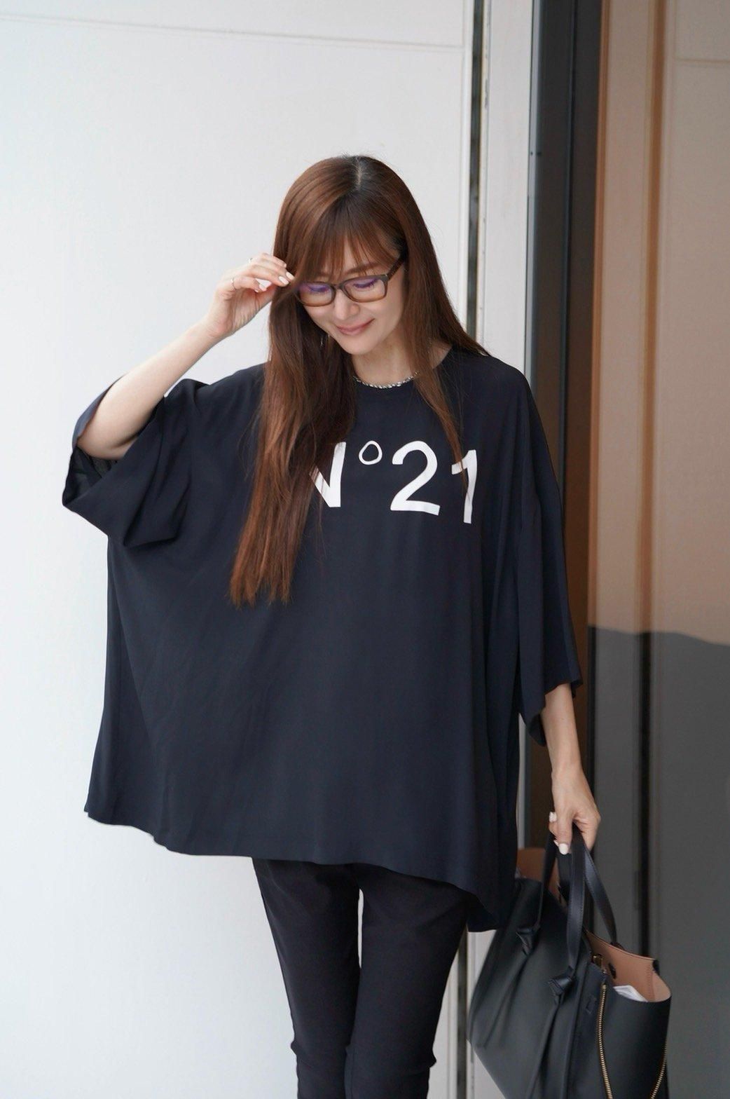 さらりとしたアセテート、光沢感のあるシルク素材に大きなブランドロゴが目立つトップスです。