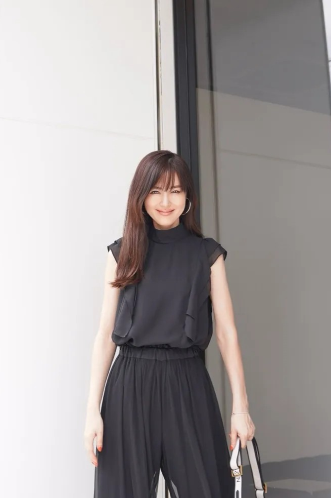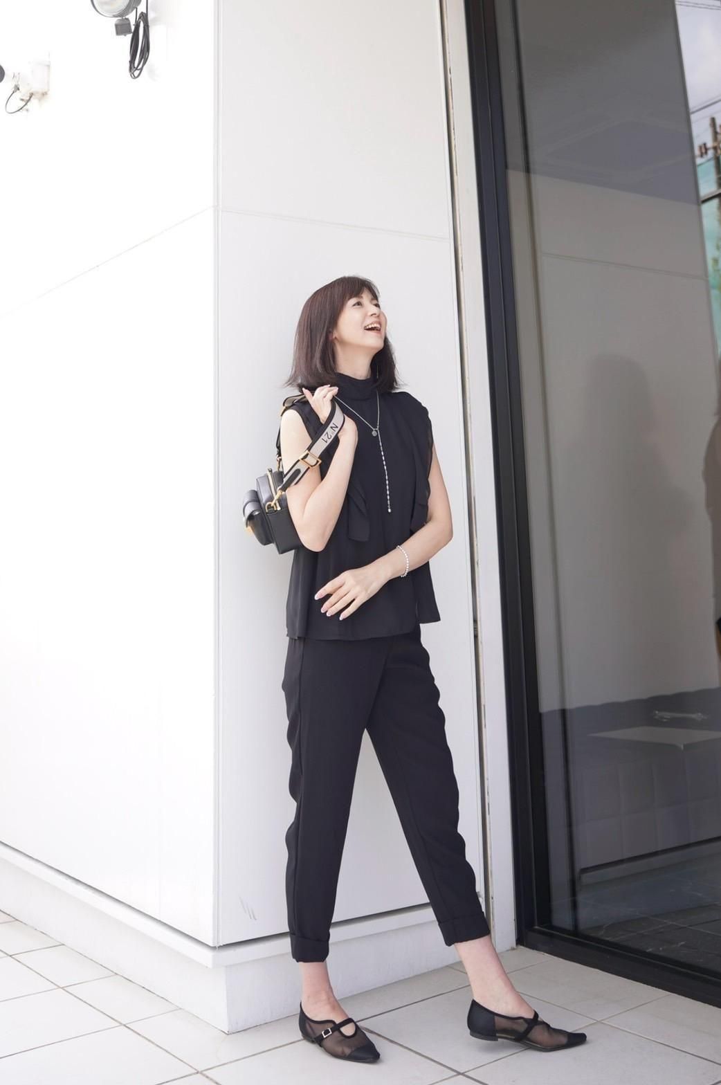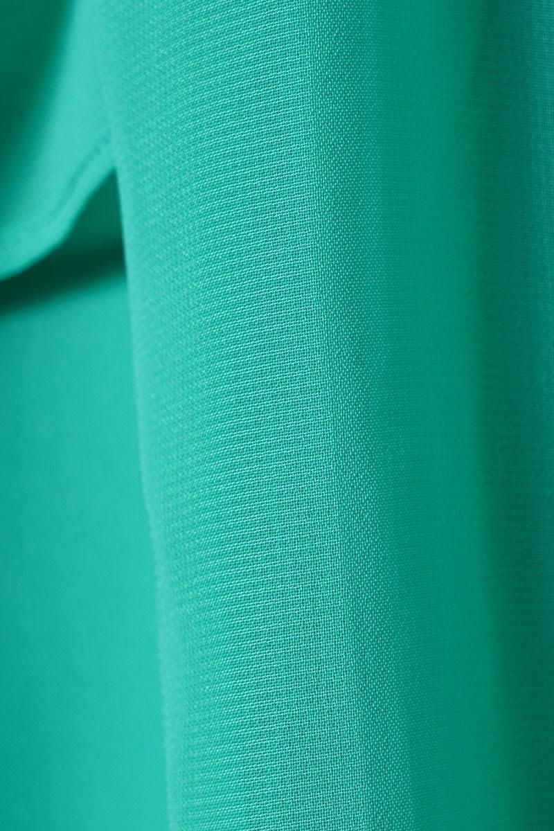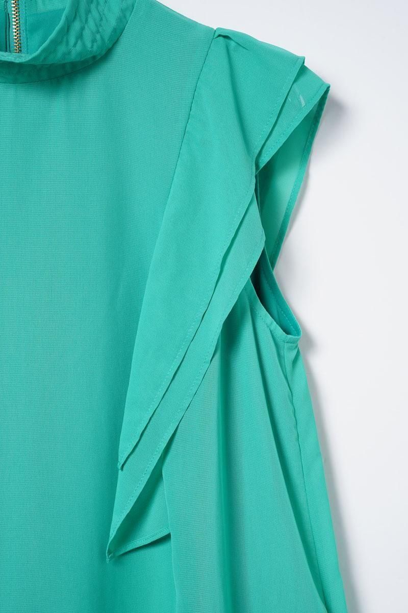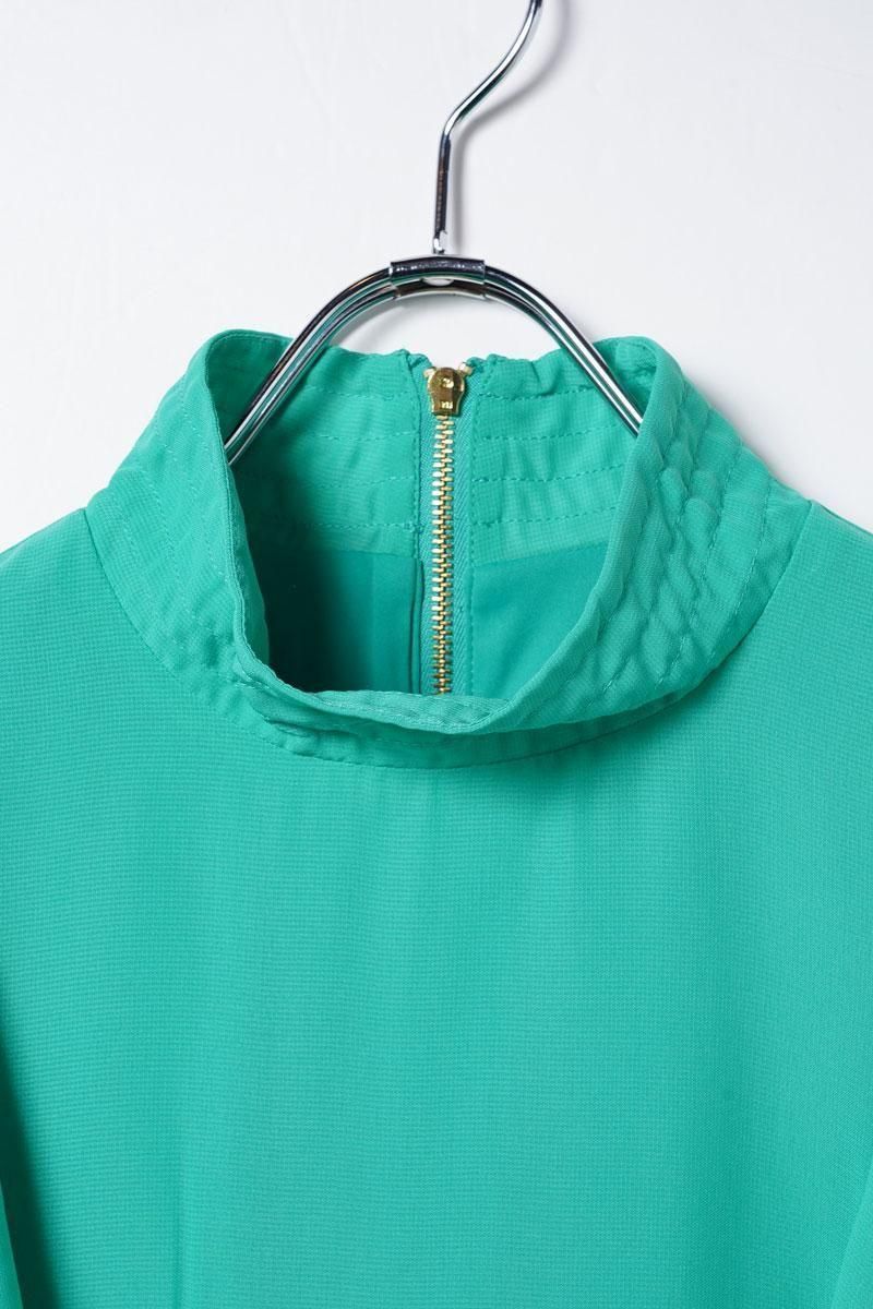 立ち上がりのある襟元が顔まわりをすっきりと見せ、肩から落ちるようにあしらわれたフリルが動きのあるシルエットに。