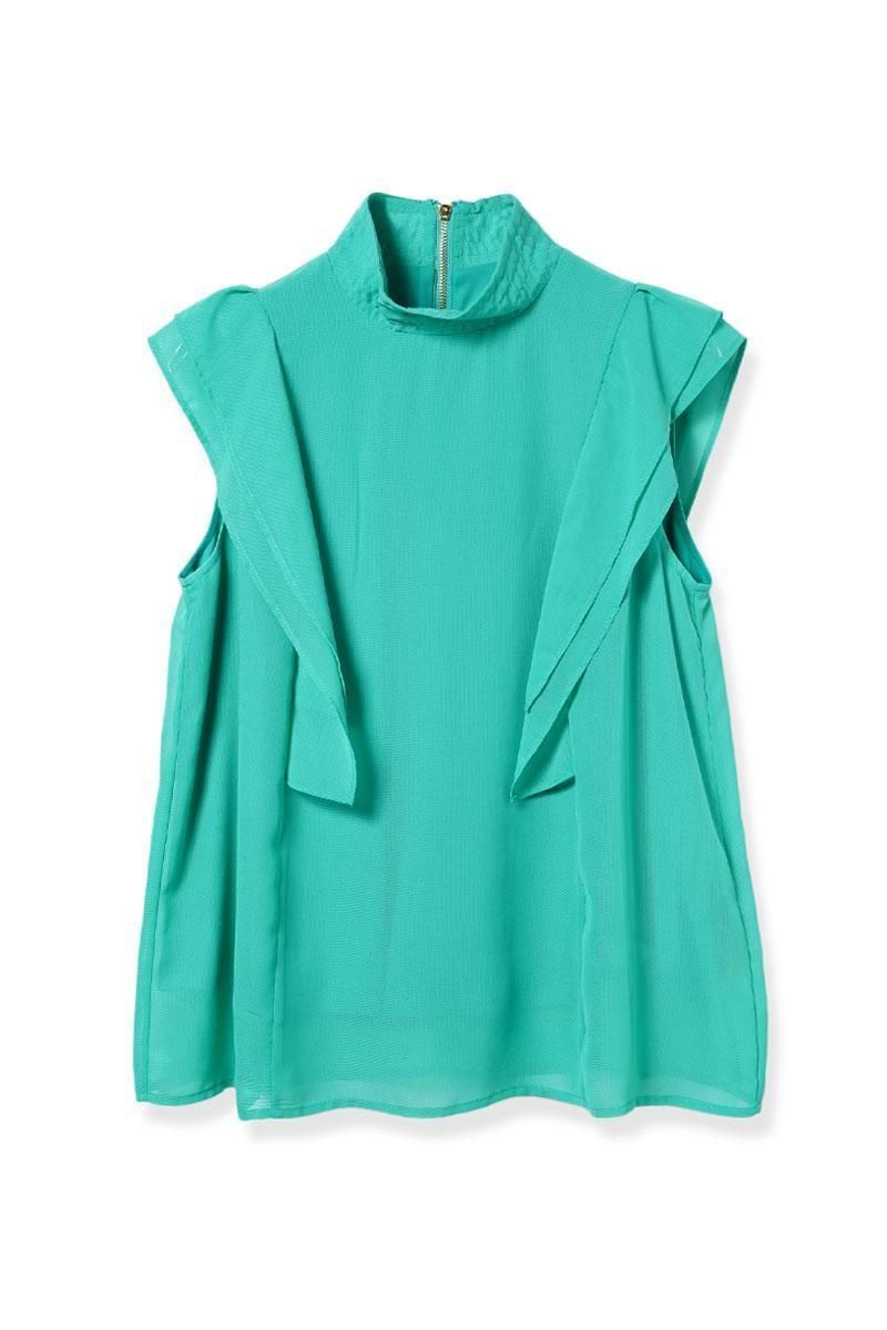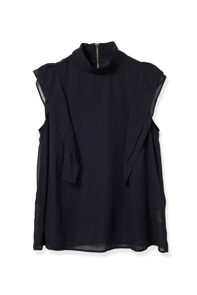 上品なハイネックデザインに、軽やかなシアー素材のフリルスリーブが華やかさを添えるブラウス。