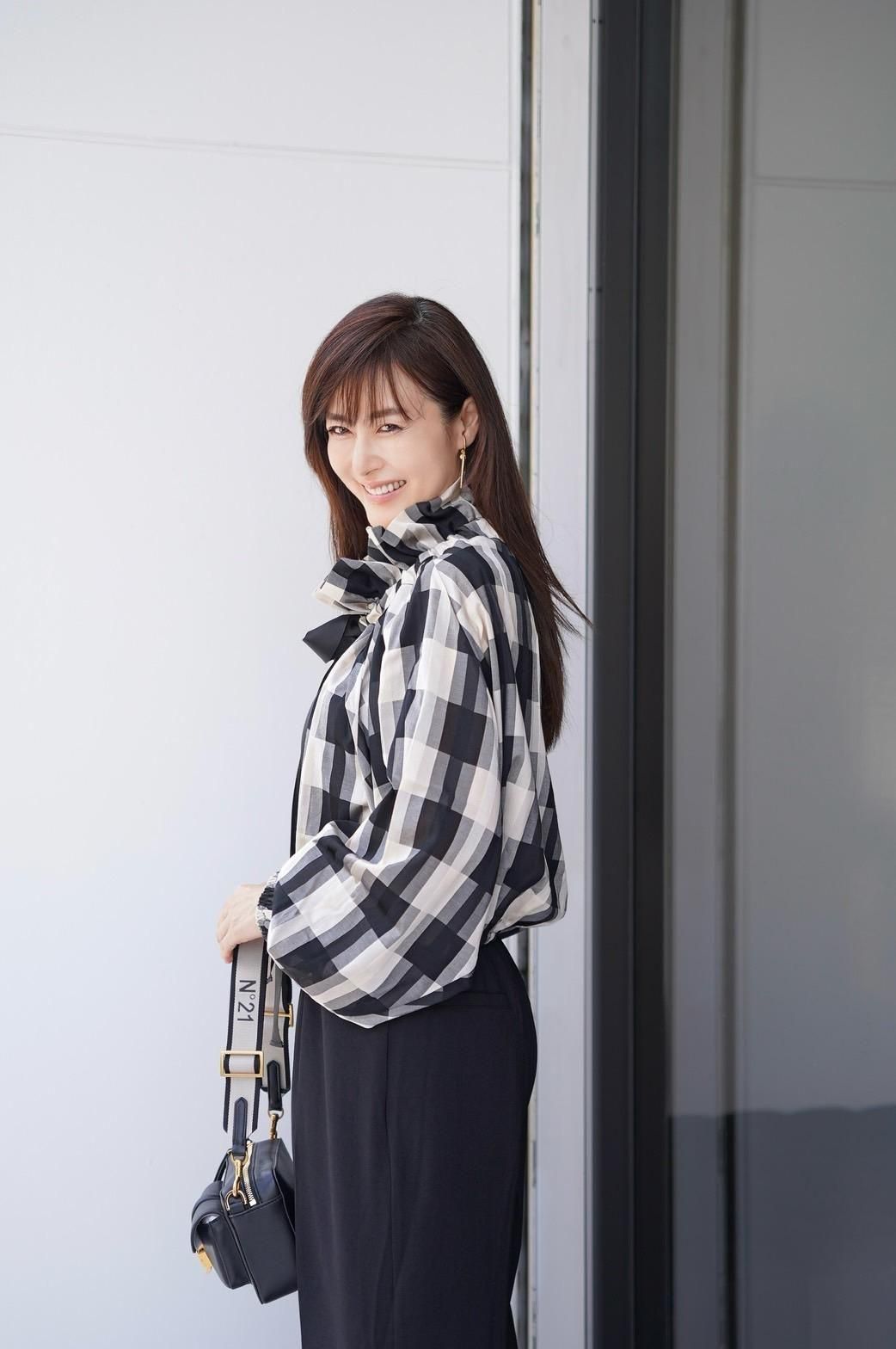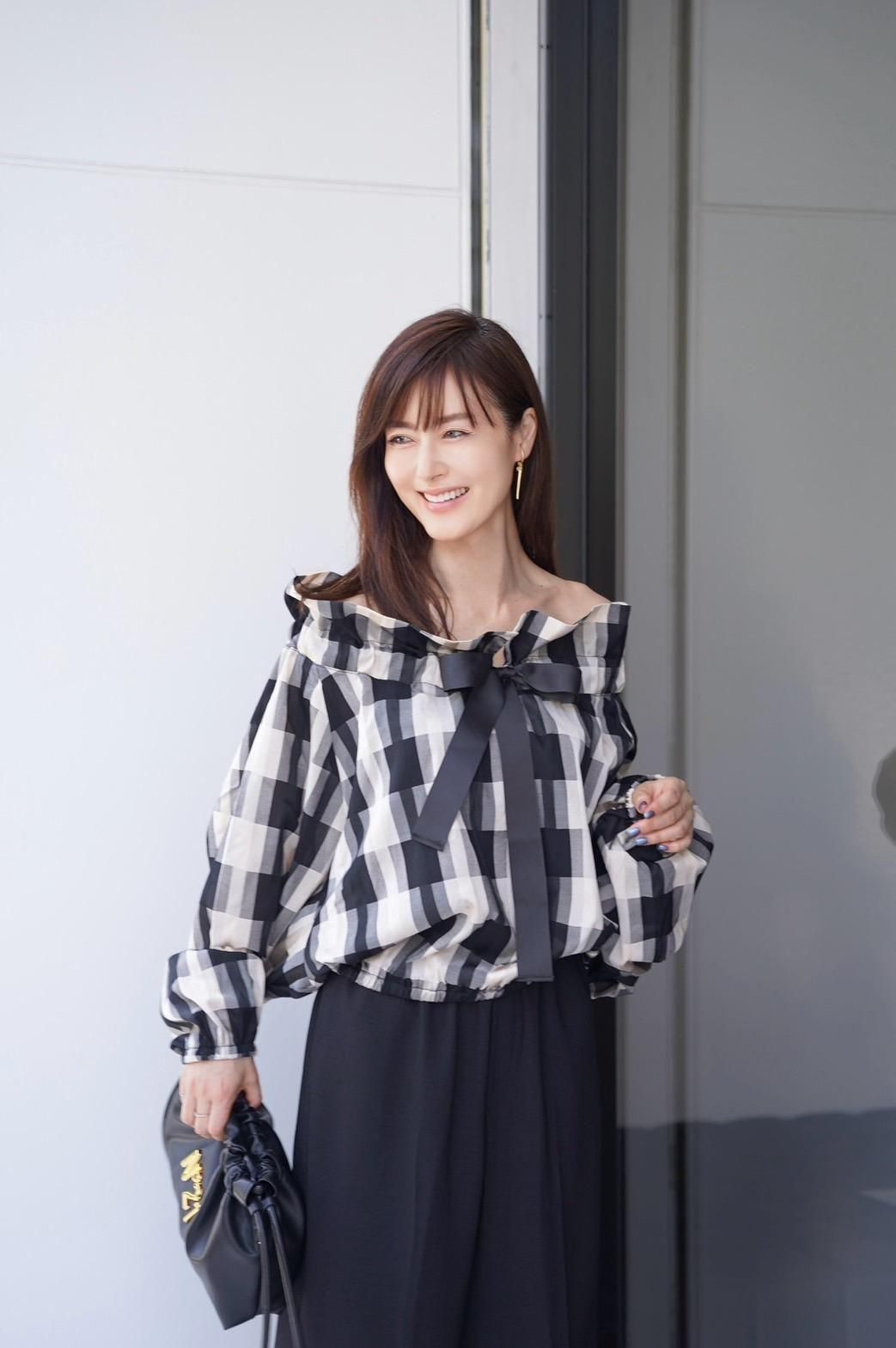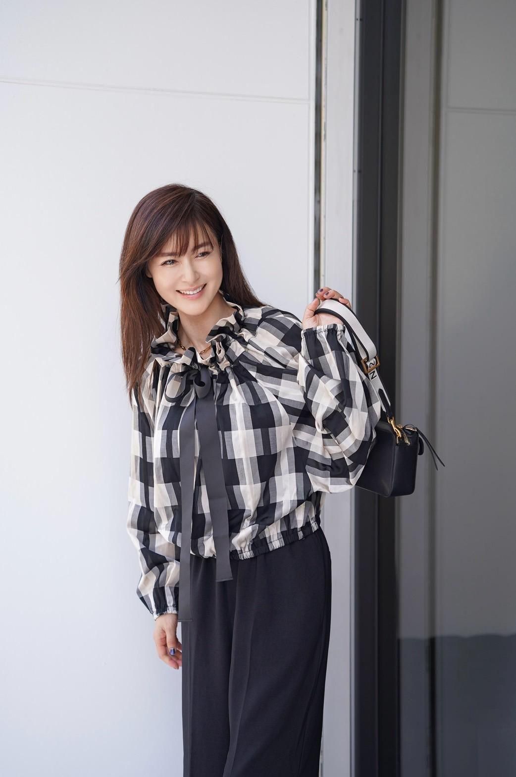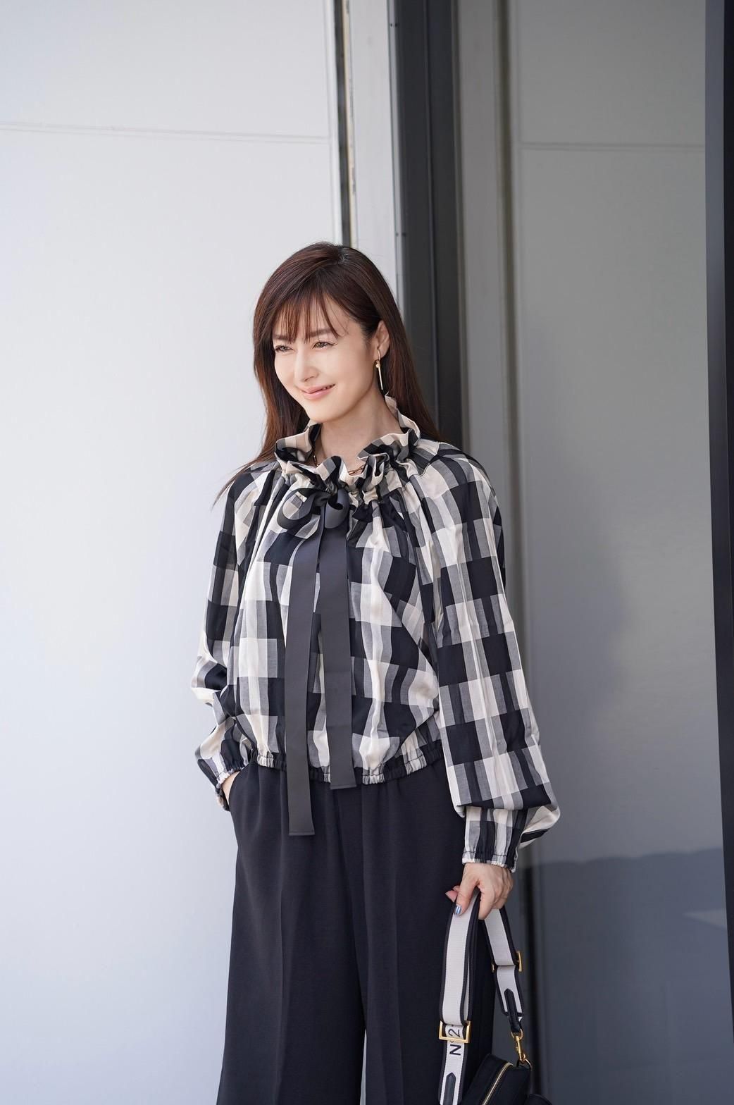 ハリ感のあるチェック柄素材に、ふんわりと立体感のあるビッグカラーとグログランリボンをあしらったブラウス。