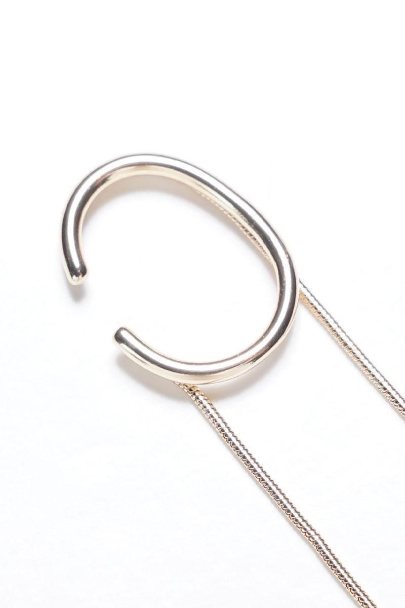 耳に沿うシンプルな丸線イヤーカフにしなやかに煌めくロングチェーンが施された上品なデザイン。