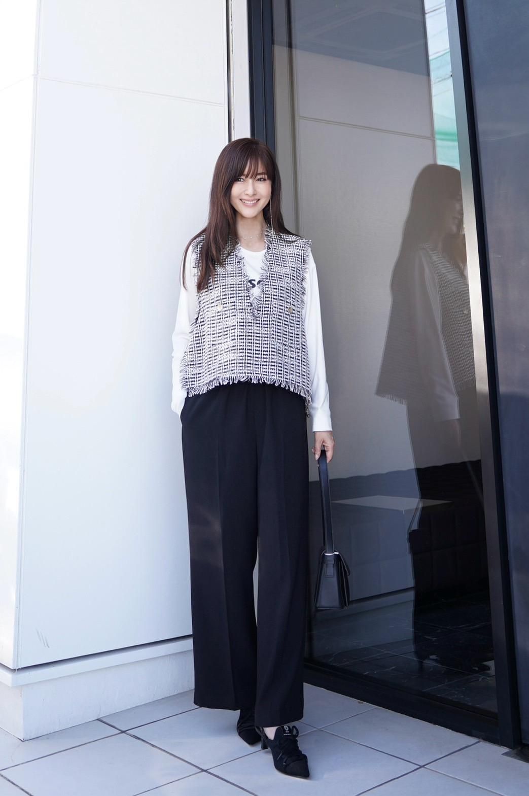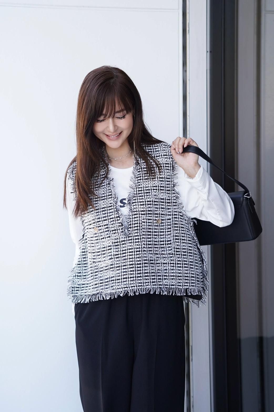 羽織るだけでコーデがランクアップするツイードベスト。フリンジがさりげない華やかさを添え、きれいなシルエットが大人の魅力を引き立てます。