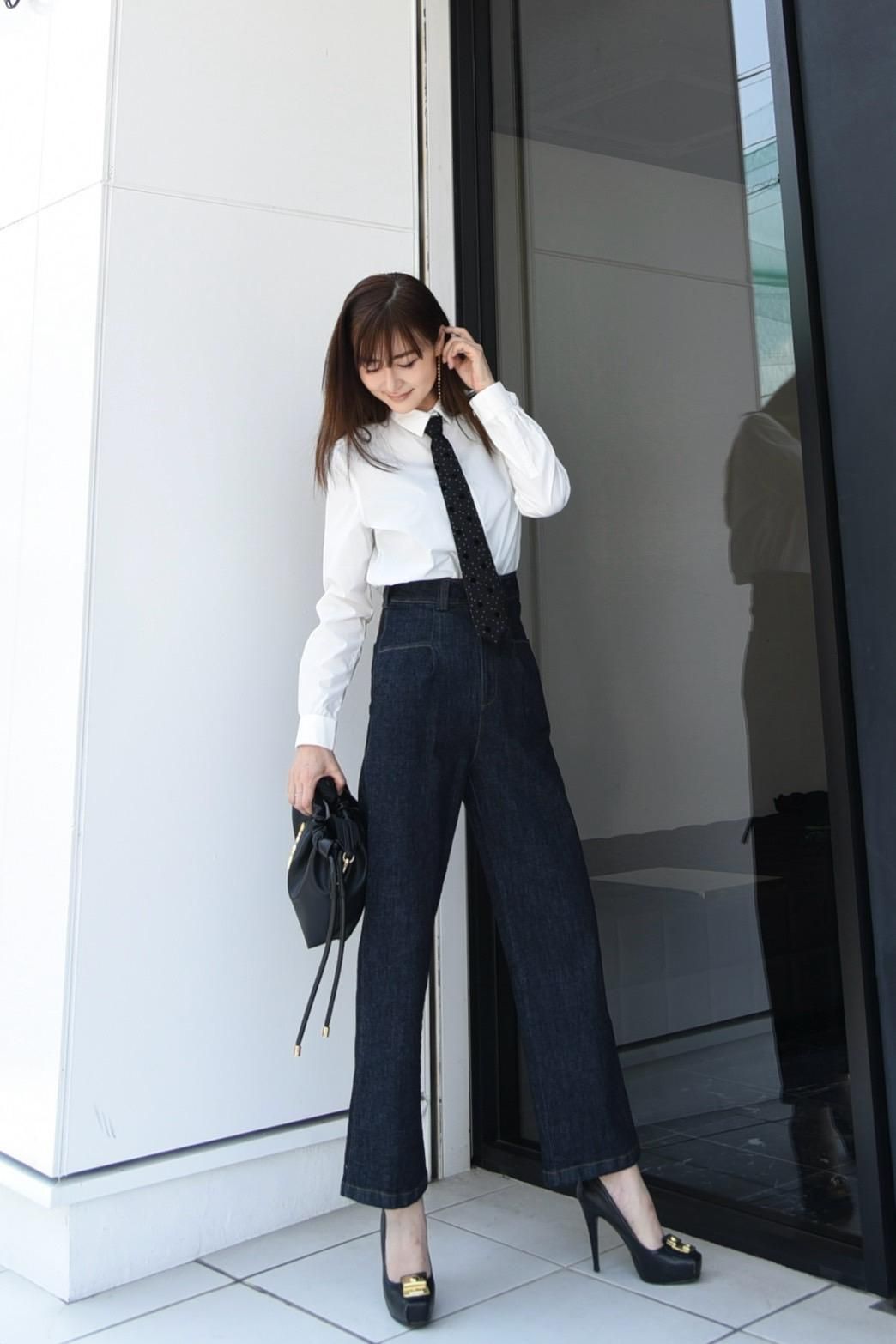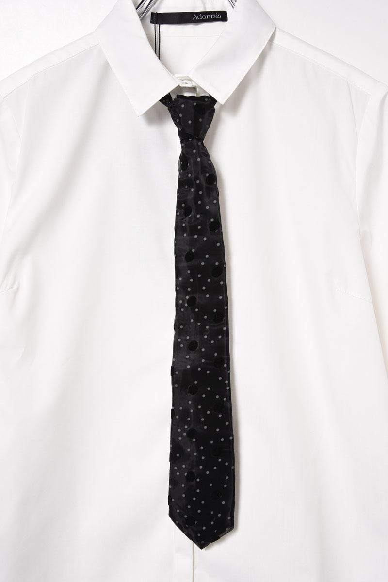 ドット柄がキュートなオーガンジーネクタイが主役の、ミニマルでコンパクトなシャツブラウスです。