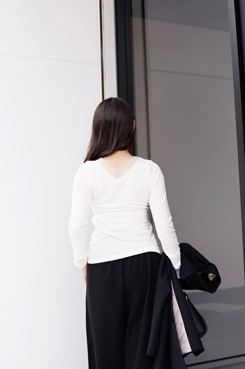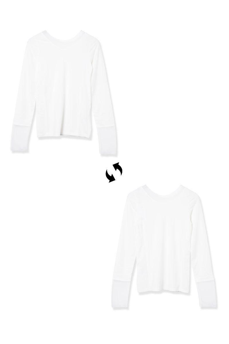 Vネックとクルーネックの両方で着用でき、前後どちらでも楽しめるデザインです。軽やかな素材感でオールシーズン活躍し、体にフィットしすぎず快適な着心地。ジャケットやベストのインナーとしてもおすすめ。夏にはタンクトップバージョンが人気だったデザインの、待望の長袖バージョンです。1枚でさまざまなスタイリングに取り入れやすい、着回し力抜群のアイテムです。