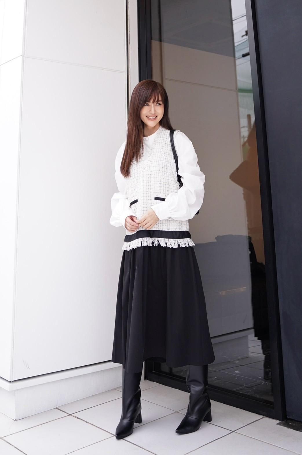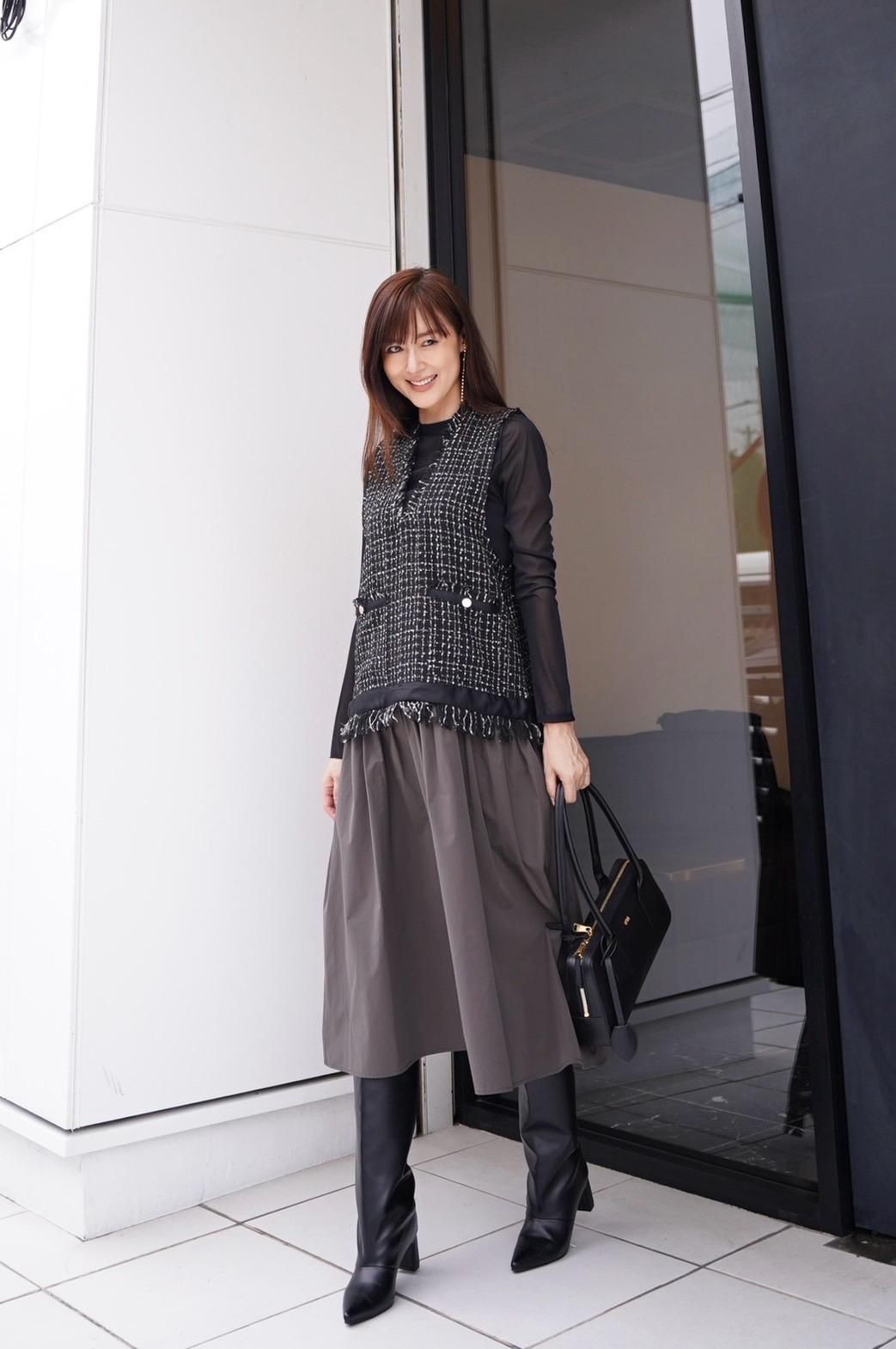 ノースリーブのツィードベスト部分はラメ糸を織り混ぜた素材で華やかさがあり、少しローウエスト位置に切り替えられたスカート部分は張り感のあるタフタ素材。