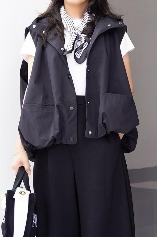 ふんわり丸みを帯びたバルーンシルエットが目を引く、フード付きベスト。