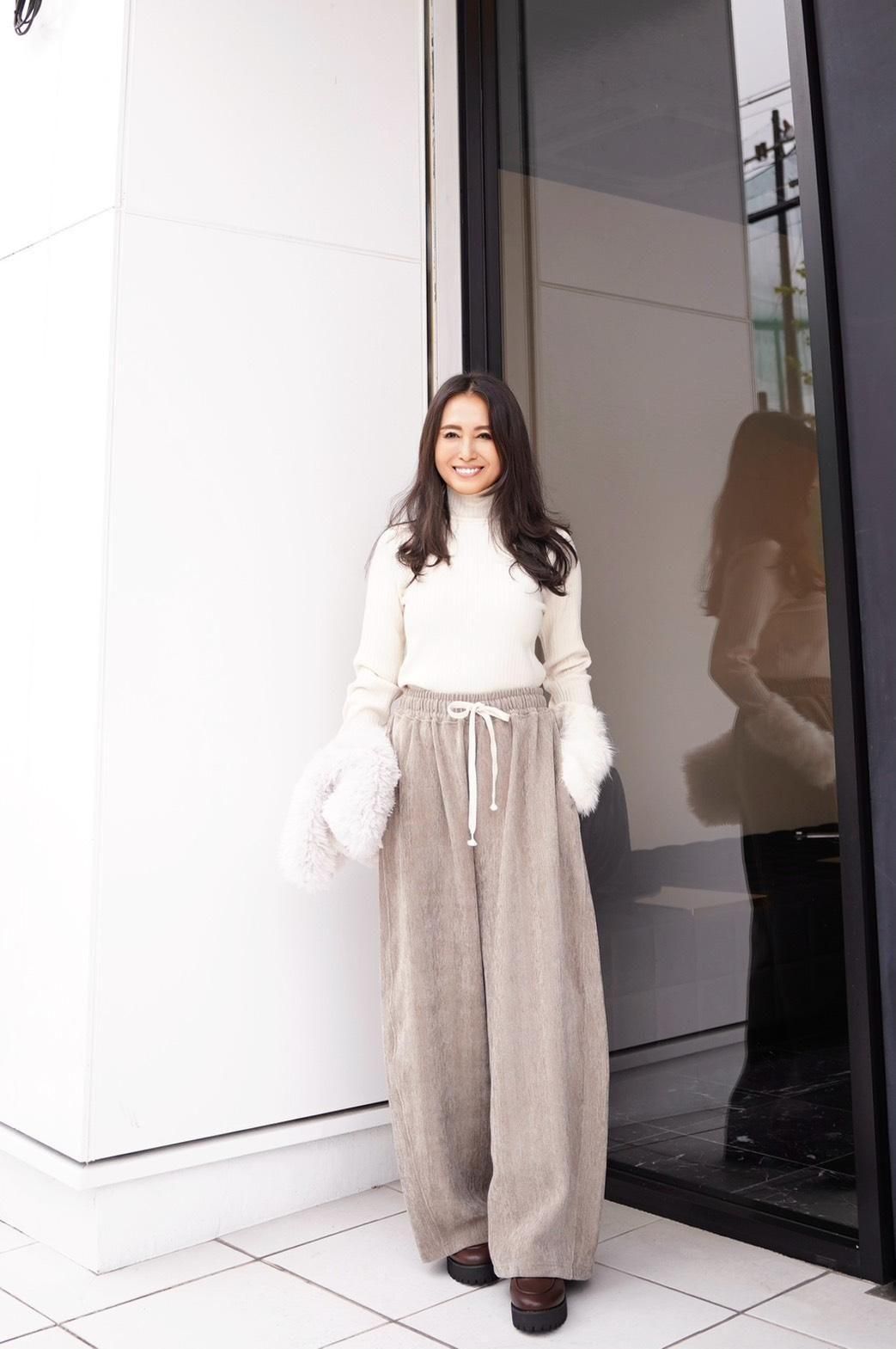 袖口のシャギーは同色で、シンプルな中に素材感の違うデザインです。