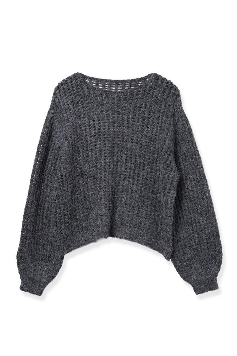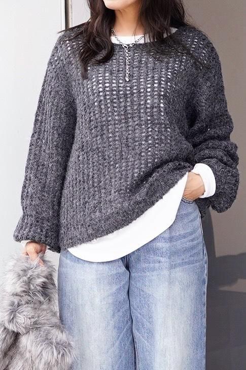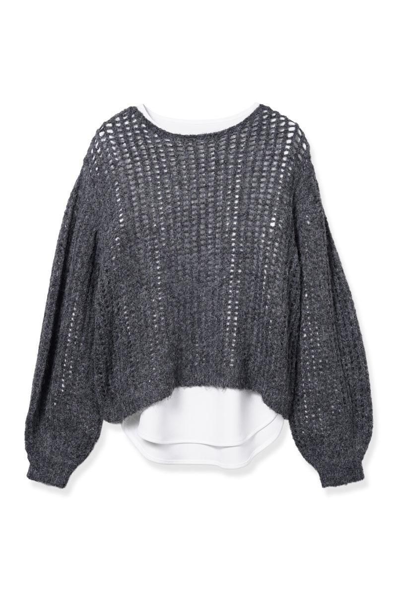 ローゲージでルーズな編み目のニットトップスと長袖ジョーゼットカットソーがセットになったアンサンブルプルオーバーです。