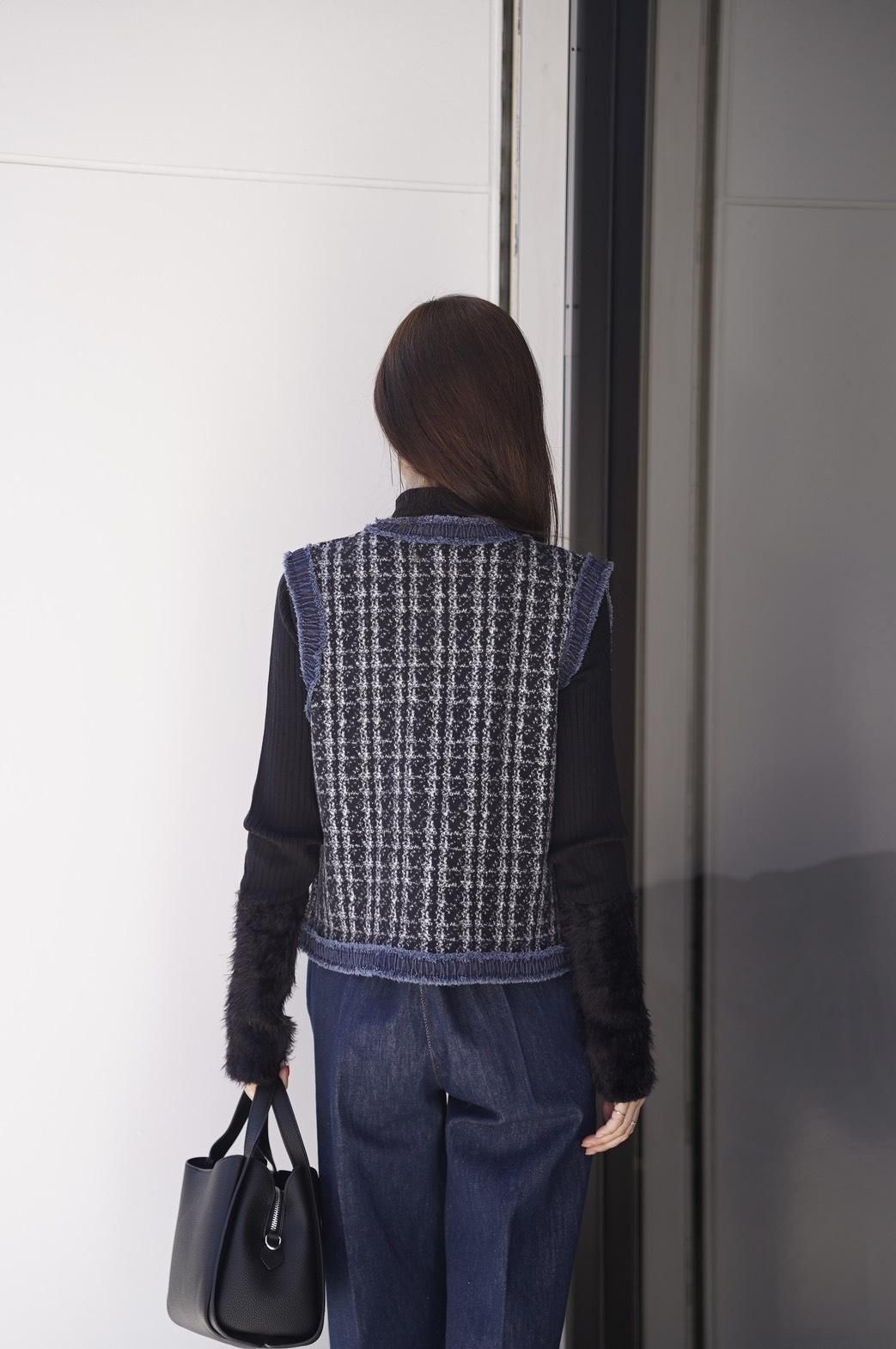 ツイード部分はニット素材なので伸縮性もあり着心地もストレスなく着ていただけます。