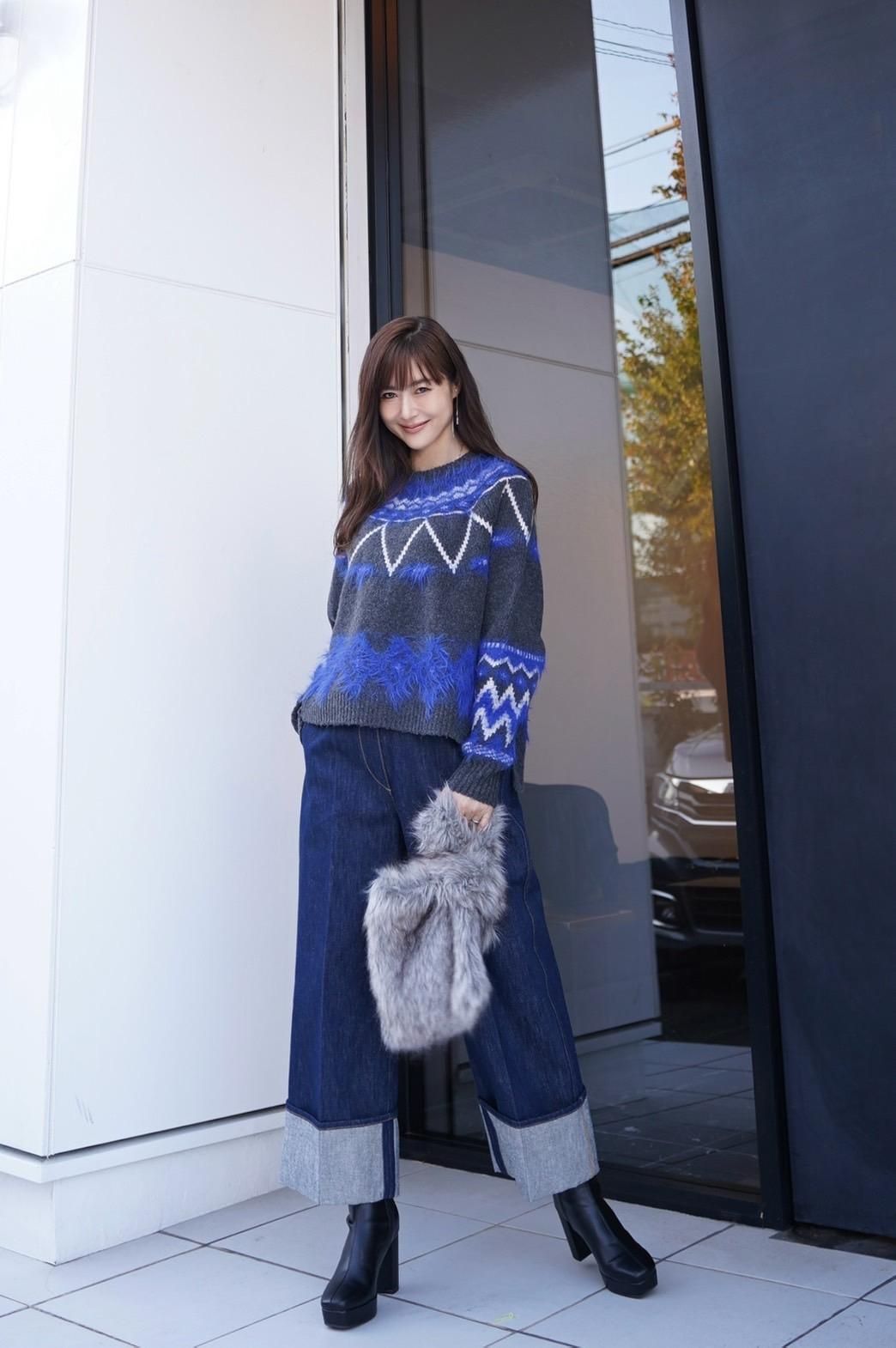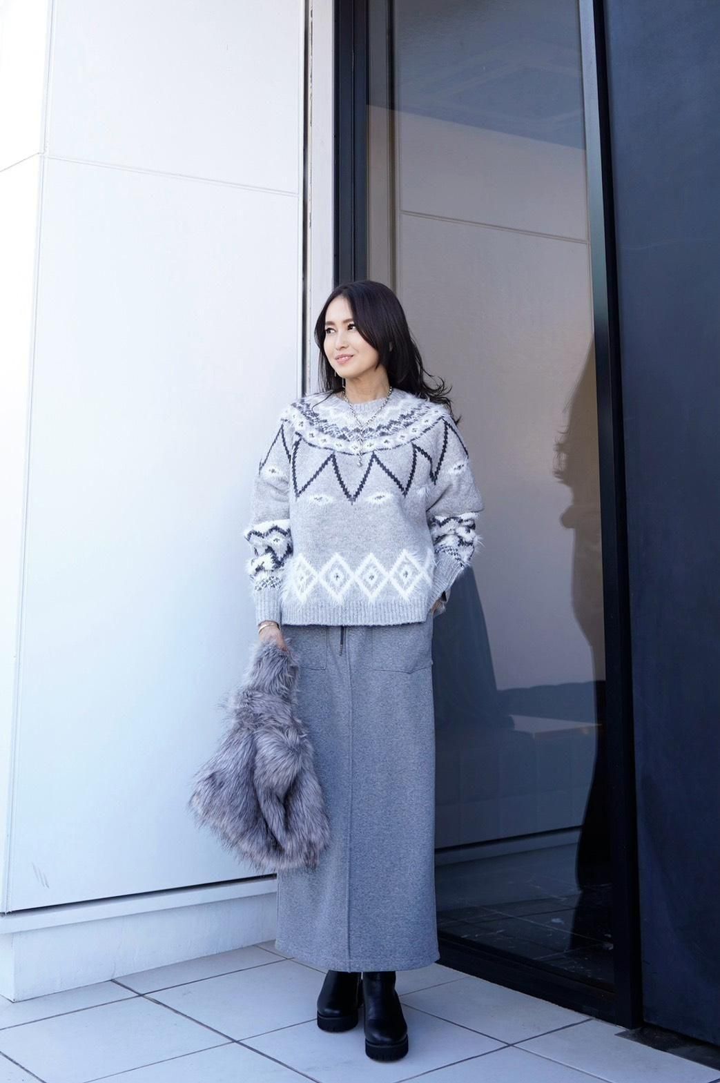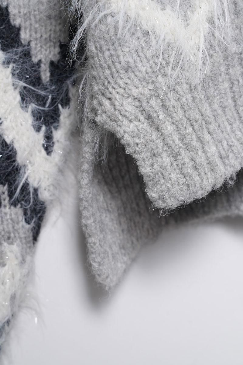 ふっくらボリュームのあるローゲージニットと毛足の長いフェザーヤーンの組み合わせが一枚で秋冬コーデの主役になる一枚です。