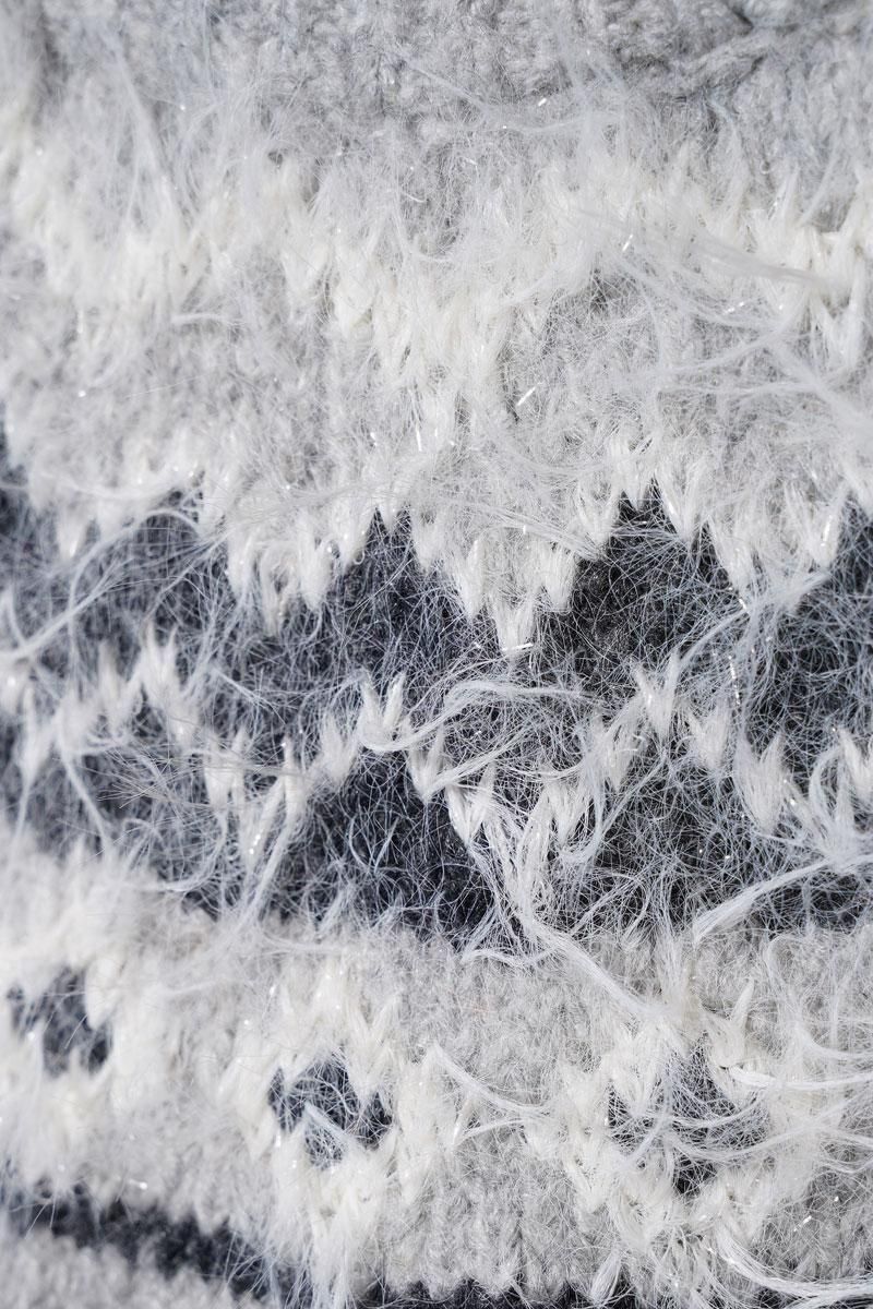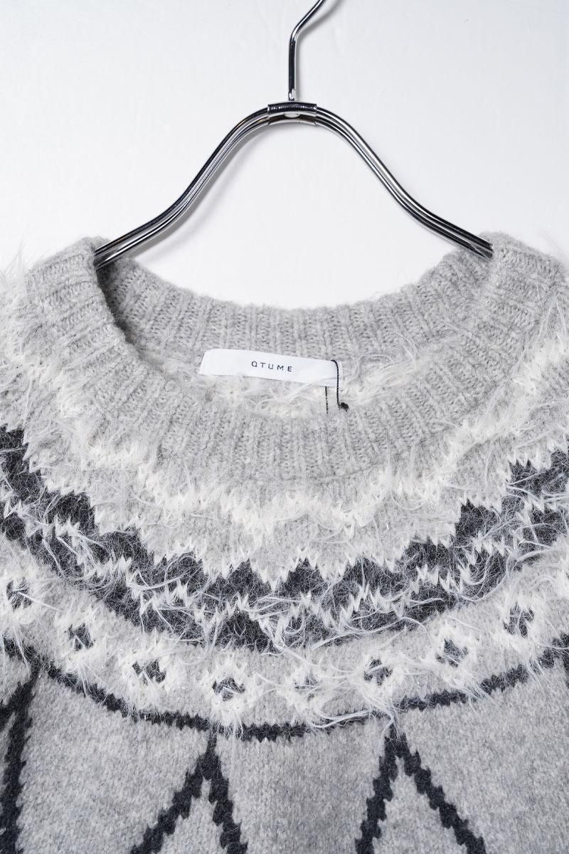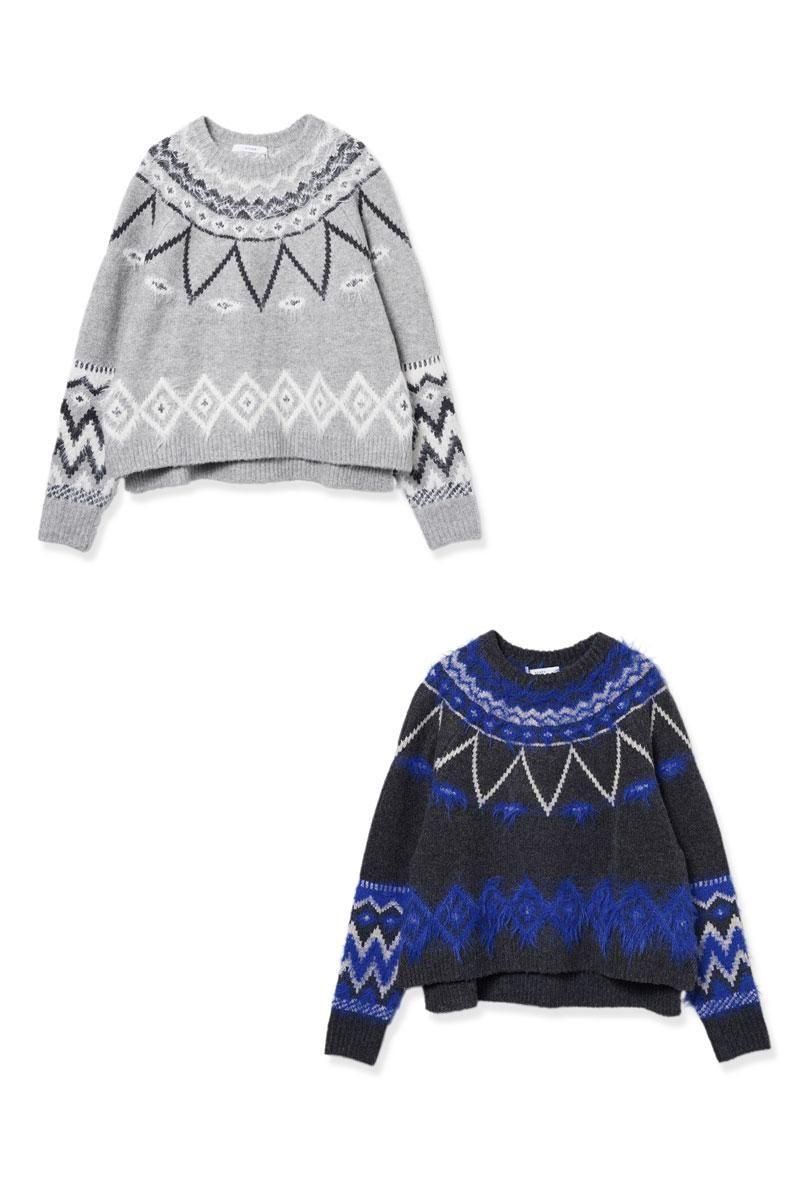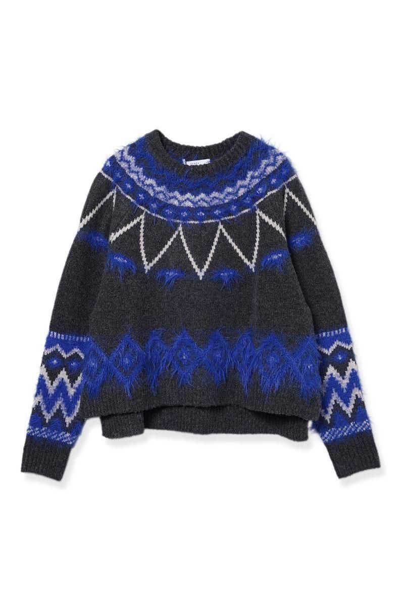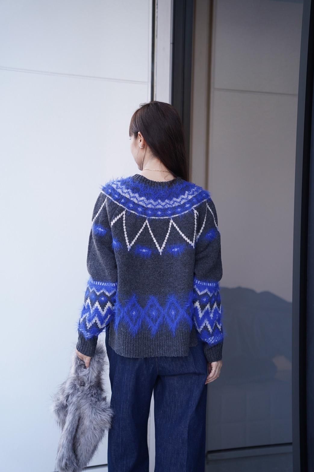 フェアアイル柄(スコットランドの伝統的な編み物)にフェザーで遊び心をプラスしたニットプルオーバー。