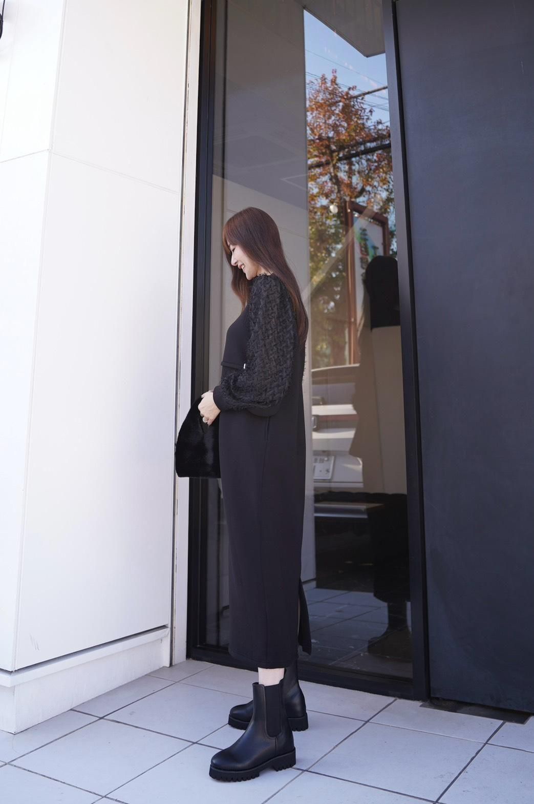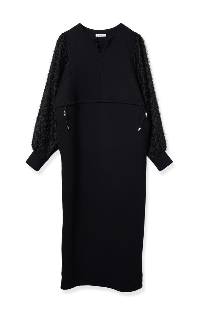 ボンディング素材ですっきりと仕上げたシルエットに、シアーシャギーのふんわりとした袖が映えるワンピース。